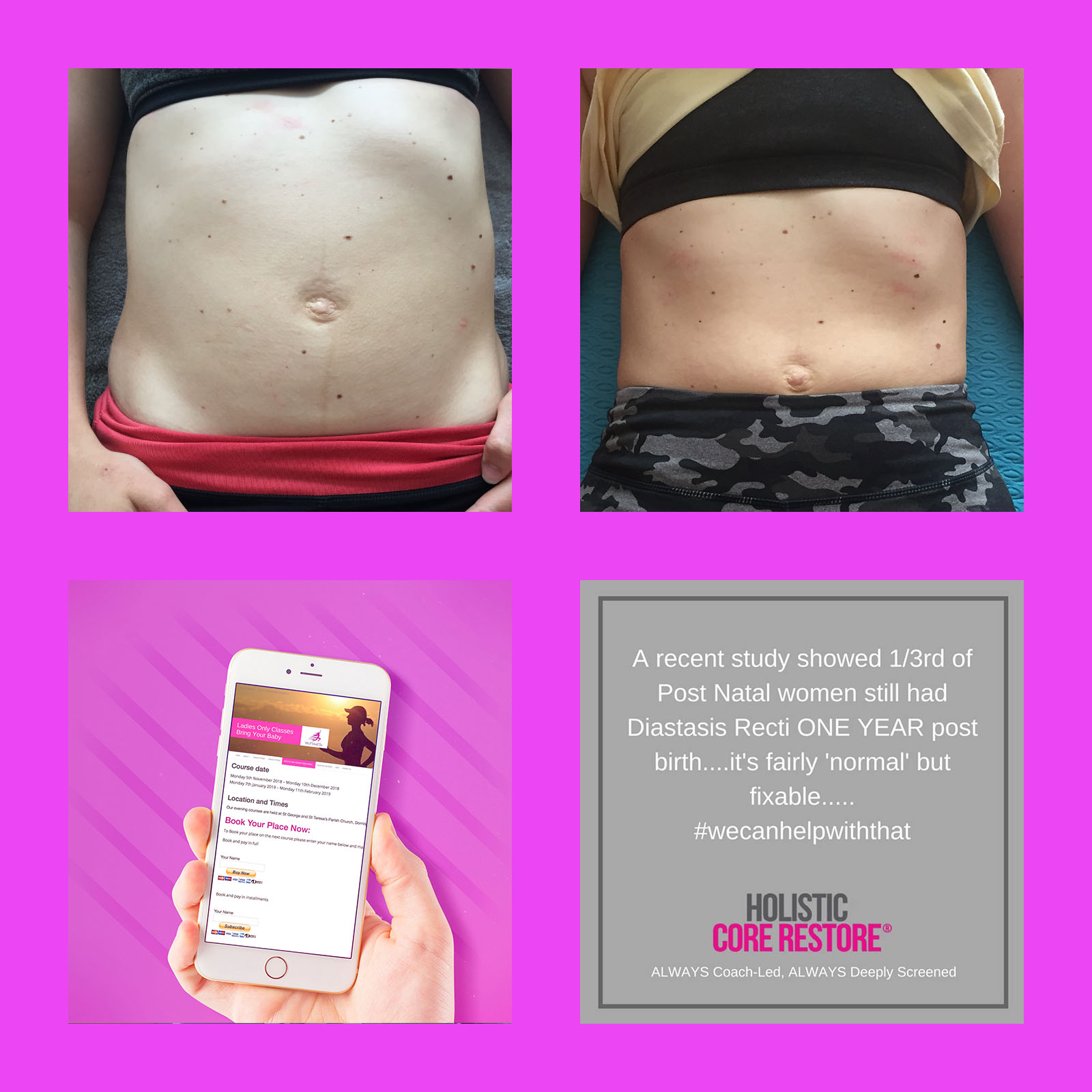 In the majority of cases Diastasis Recti spontaneously improves to within a normal range by 8 weeks postnatal, yet studies show that about 40% don’t improve on their own and specific restorative exercises are needed. Visually a diastasis can make you look like you’re still pregnant, you can feel disconnected to your abdominal area due to the muscles being weak and lengthened. When lying down or relaxed your abdominal area may look more normal yet the ridge will become more prominent whilst coughing, sneezing, sitting up or straining, this is due to too much intra-abdominal pressure against a weak structure.